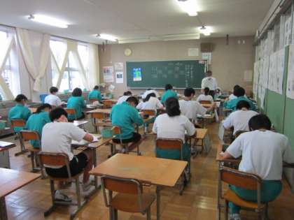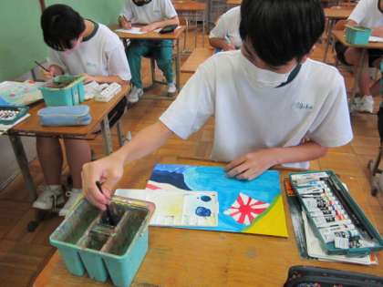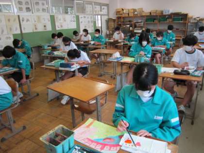 「自由構想画」の学習です。それぞれ考えたデザインに近づくように、グラデーションなどを工夫しています。作品作りにとても集中しています。