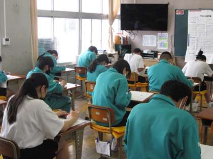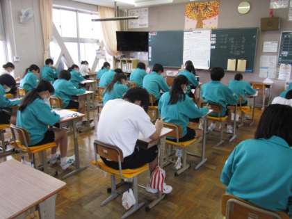 3年生は学力診断調査にとりくんでいます。進路希望先を決める参考になるということもあり、夏休みも学力診断調査に向けて一生懸命勉強してきました。頑張ってきた成果を出し切ろうと、最後まで真剣にとりくんでいます。