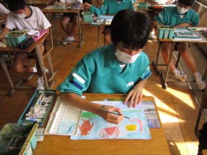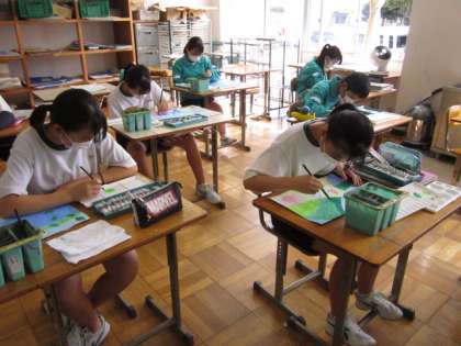 1学期から続けている構想画の完成も近づいてきました。いろいろな色を使って、彩色にとりくんでいます。