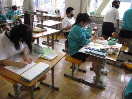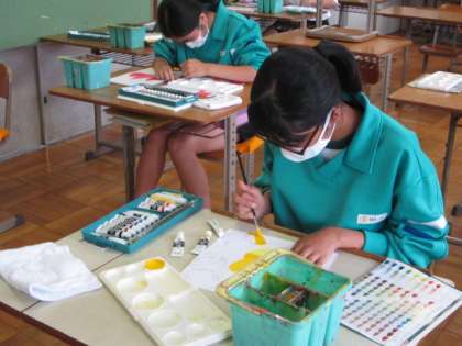 「色塗り」の授業です。自分で描いた果物に、独自性のある色彩で色を塗っています。