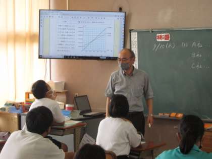 「一次関数のまとめ」の学習です。文章問題を解きながら、一次関数の応用の仕方を考えています。