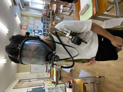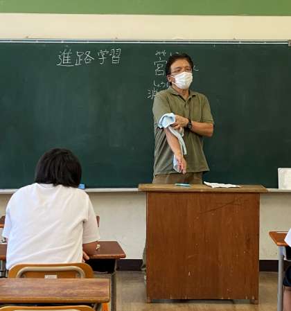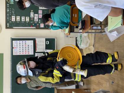 D組では、進路学習をしています。用務員の宮代先生に前職の消防士についての講話を聞き、その後消防の服や装備を体験させてもらいました。