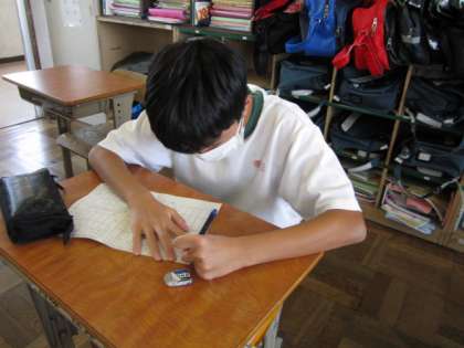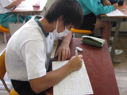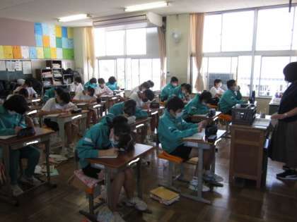 毎時間行っている漢字テストの様子です。授業前の休み時間には、多くの生徒が漢字テストに向けて勉強しています。細かいミスがないように、真剣にテストにとりくんでいます。