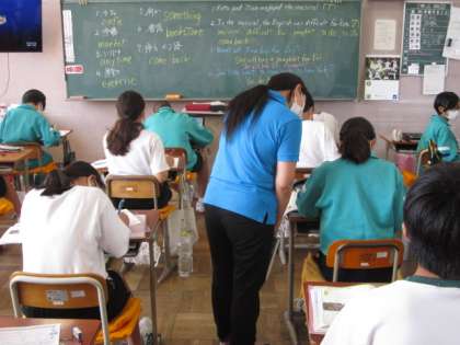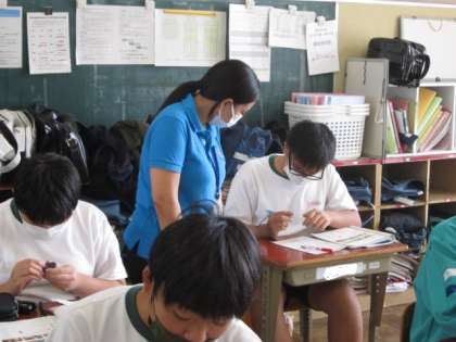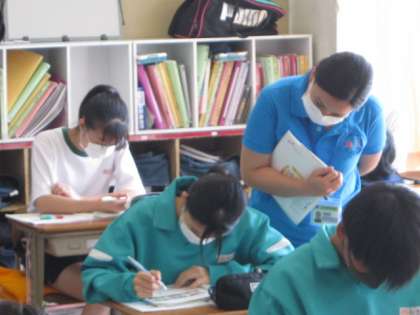 「Tour in New York City」の学習です。ニューヨークの特徴や登場人物の思っていることなど本文から読み取っています。ALTからもヒントをもらい、問題にとりくんでいます。