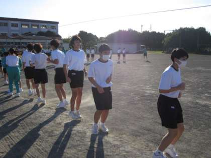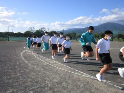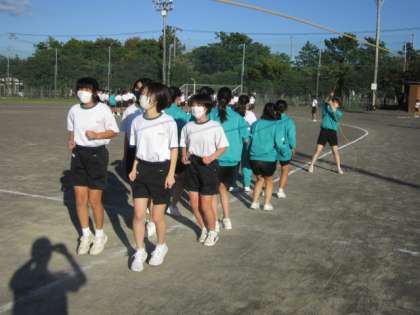 体育祭に向けた長縄練習の様子です。前回は10回も跳べなかったのですが、今回はどのクラスも20回以上跳べるようになりました。並び方や縄の回し方を工夫し、これからどんどん回数を増やしていきたいですね。