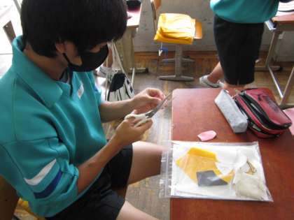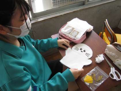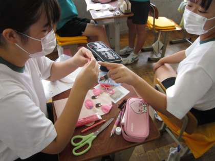 「パペット人形づくり」の学習です。かわいい動物の人形になるように、細かいところまで気を遣い、とても真剣に裁縫にとりくんでいます。