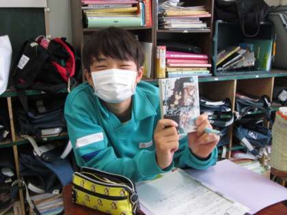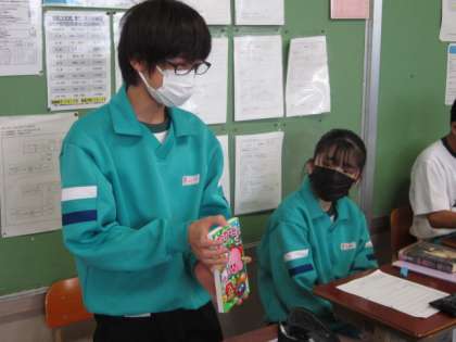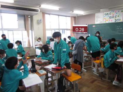 「ビブリオバトル」の学習です。聞いている人たちに読んでみたいと思ってもらえるように、お気に入りの本の魅力を表現ゆたかに伝えています。