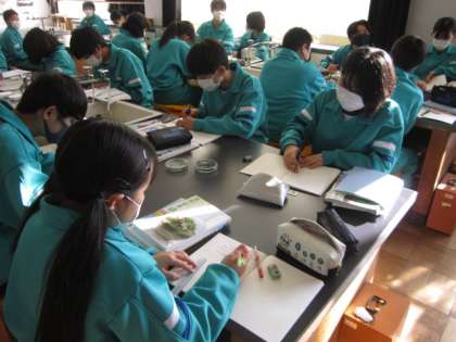 「マグマが固まった岩石」の学習です。「火山灰に含まれる鉱物はどのようなものだろうか」という課題に対し、実際に観察してわかったことをノートにまとめています。