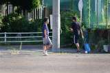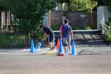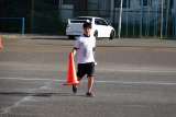 グラウンドにコーンを置いたり、ラインをひいたりしています。