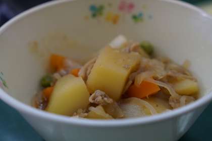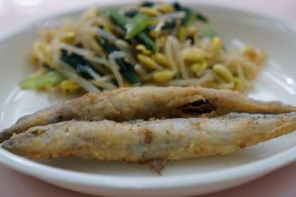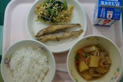 ご飯、牛乳、肉じゃが、ししゃもの竜田揚げ、もやしと小松菜のおひたし
