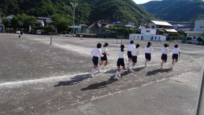 グラウンドでは、女子テニス部が、声を出して走っています。