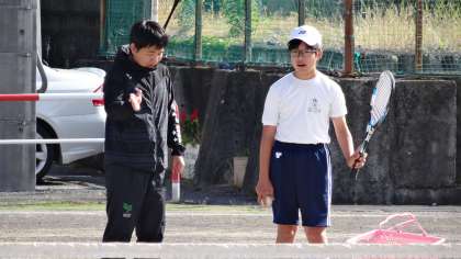 渡部先生が男子テニス部の指導を行っています。生徒一人一人に丁寧に対応しています。