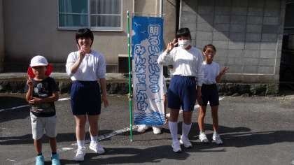 玄関前では、小中合同の挨拶運動です。日差しがだいぶ強くなっています。