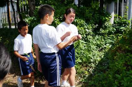 1年生は蒸散の学習に続いて、学校にある他の植物で、蒸散される水がどのように取り入れられていくか調べていきます。まずは、校内の植物を探しています。