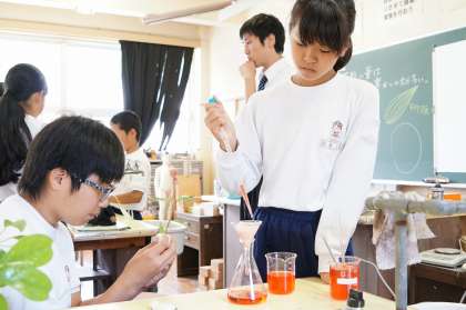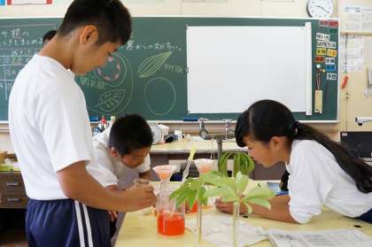 色のついた水をろ紙でこして、植物にすわせるように準備をしています。