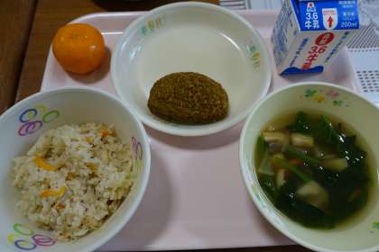 駿河湾のしらす干しご飯、牛乳、黒はんぺんお茶フライ、けんちん汁、冷凍みかん
