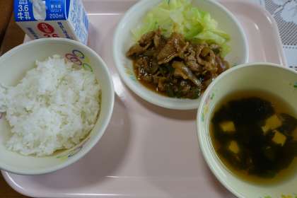 ご飯、牛乳、スタミナ焼肉、ボイルドキャベツ、わかめスープ