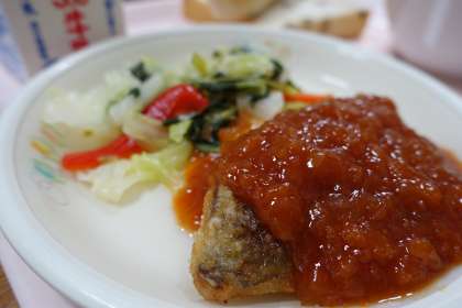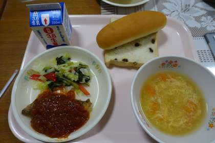 レーズンパン、ロールパン、牛乳、ホキのチリソースがけ、野菜ソテー、豆腐と玉子のスープ