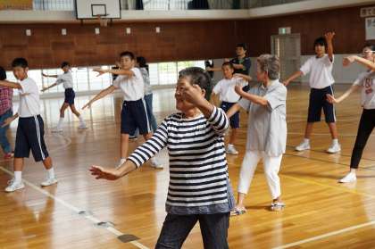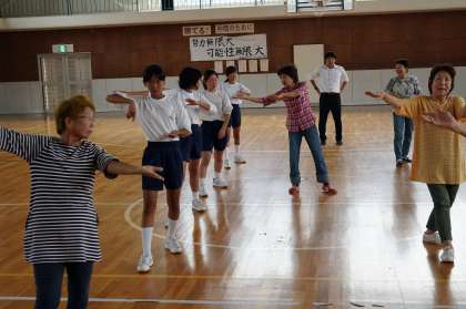 本校では、例年、地域の伝統文化を学習する目的で、潮風祭にて「漁師踊り」を踊っています。今日は、1年生が「戸田漁師踊り・漁師唄保存会」の皆様に、踊りを教えていただきました。生徒は、戸惑いながらも楽しそうに踊っていました。