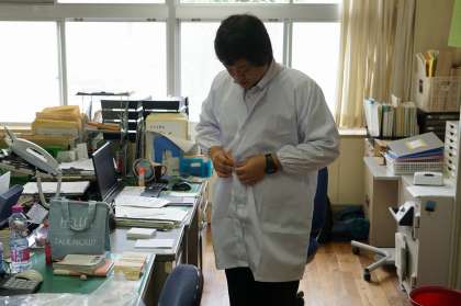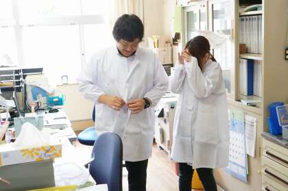 「給食着の大きさが、生徒に合っているか確かめるため必要がある」と言うことで、事務室の2人が試着をしましたが・・・考えてみれば生徒に着させればよいような・・・。