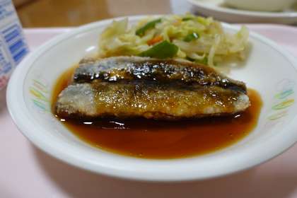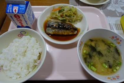 ご飯、牛乳、イワシの蒲焼き、キャベツともやしの炒め物、豆腐とわかめの味噌汁