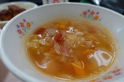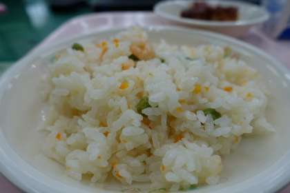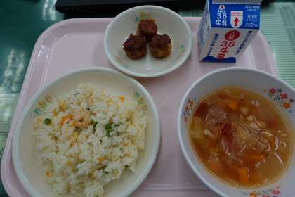 シーフードピラフ、牛乳、シラス入り揚げシューマイ、まめと野菜のスープ