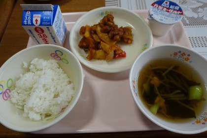 ご飯、牛乳、鶏肉の中華カレー炒め、わかめスープ、丹那ヨーグルト