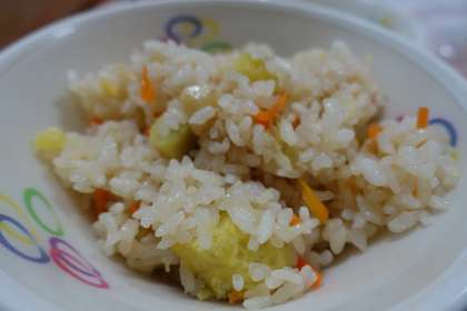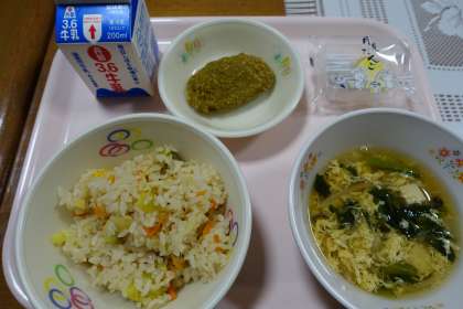 薩摩芋と栗のご飯、牛乳、黒はんぺんのお茶フライ、かき玉汁、お月見デザート