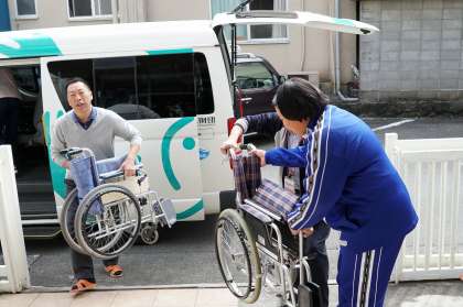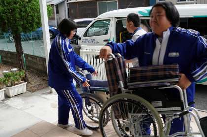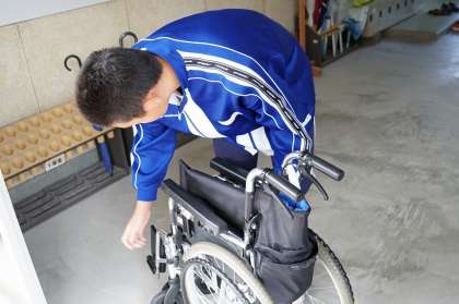 今日は、三浦・戸田地域包括支援センターの鈴木様を講師にお迎えして、学習を行います。学校に到着した車いすを会議室に運びました。この後、体験を行います。