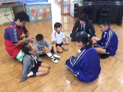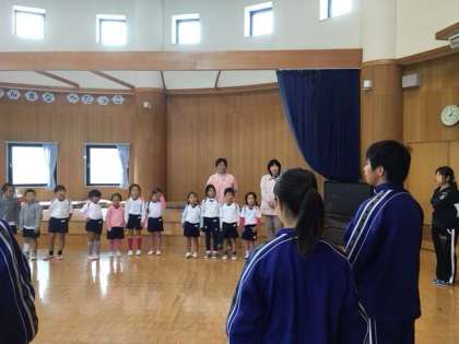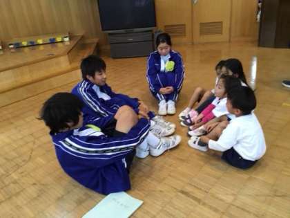1年生は、26日の保育体験に向けて事前訪問に行ってきました。自分たちの名前を覚えてもらうために、各グループ名前当てゲームやジェスチャーゲームなどをして交流をしました。