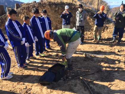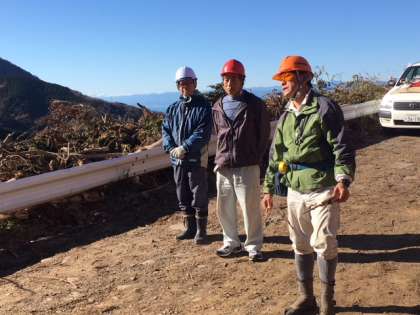 林業体験開始です。急斜面を登りまずは、植林体験です。戸田森林組合の方からやり方を教えていただきました。