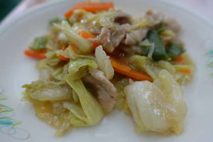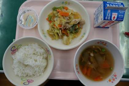 ご飯、牛乳、回鍋肉、キノコ汁、すり下ろしリンゴ