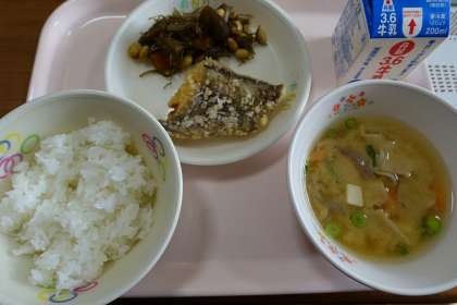 ご飯、牛乳、ホキの唐揚げ、五目煮豆、豚汁