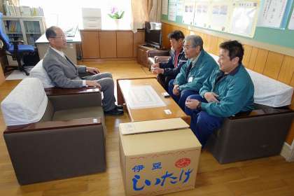 JA伊豆の国様、生産者の鈴木様が学校へお越しになり、干し椎茸をいただきました。