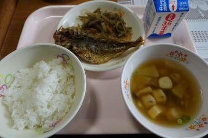 ご飯、牛乳、アジのひもの、きんぴらごぼう、すまし汁