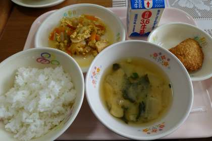 カツ丼、牛乳、豆腐と大根の味噌汁