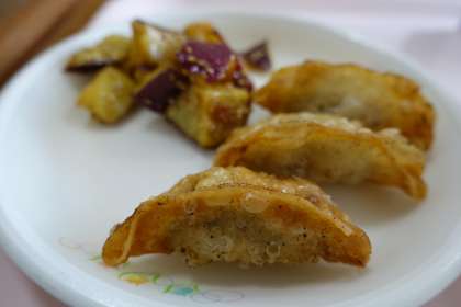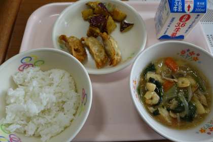 ご飯、牛乳、八宝菜、揚げ餃子、大学芋