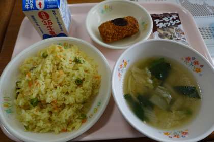 シーフードピラフ、牛乳、大中寺芋コロッケ、ベーコンと野菜のスープ、アーモンド小魚