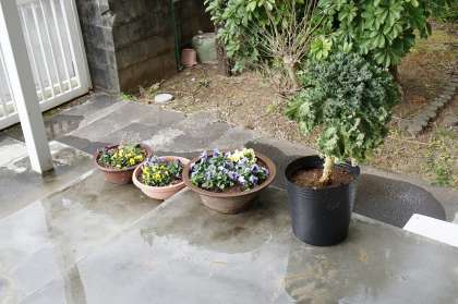 玄関の花は、花の会の皆様から。用務員の「のりさん」が水を与えてくださいました。