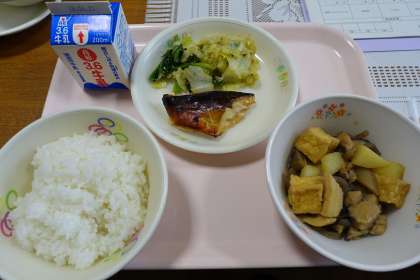 ご飯、牛乳、鯖の照り焼き、おひたし、筑前煮、すこやかふりかけのり