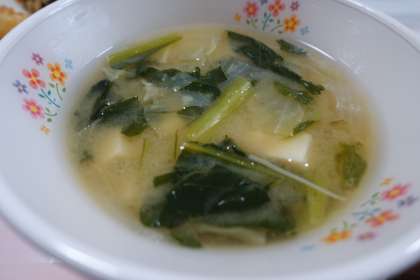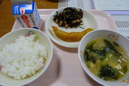 ご飯、牛乳、いかの更紗揚げ、ひじきと大豆の炒め煮、豆腐とキャベツの味噌汁