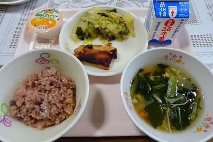 赤飯、牛乳、鶏肉の味噌焼き、キャベツとわかめのおひたし、うずらの卵とえのきのすまし汁、みかんゼリー