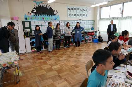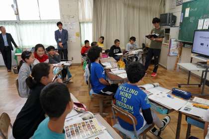 小6の社会。先生が使っているのは、タブレットPCです。正面のディスプレイに映像が映るはずなのですが・・・。お客さんがお見えのときに、うまく写りませんでした。残念です。