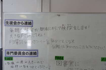 先日の評議員会でも、生徒の皆さんがあいさつをよくしてくれるとお褒めの言葉をいただきました。生徒会の活動をこれからも、お願いします。