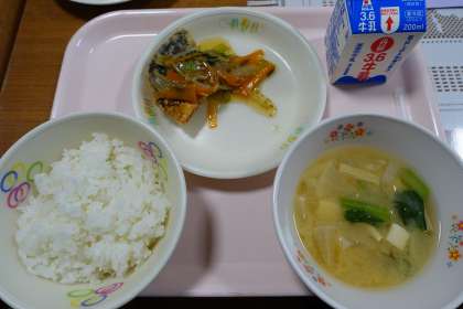 米飯、牛乳、鯖の野菜あんかけ、大根とえのきの味噌汁