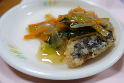 鯖の唐揚げに野菜のあんかけです。ぱりぱりの衣に野菜のあんがよくからんでいました。