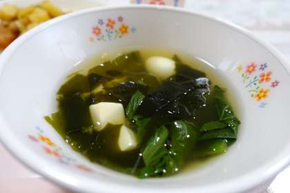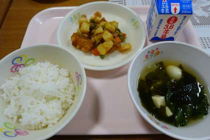 米飯、牛乳、いかの五色揚げ、うずらの卵とわかめのすまし汁