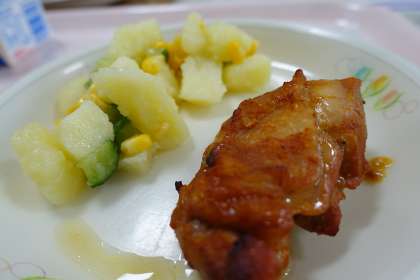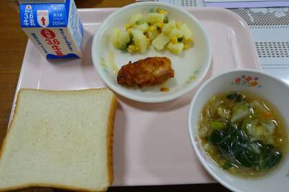 食パン、牛乳、タンドリーチキン、マエドアンサラダ、春雨スープ