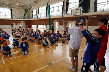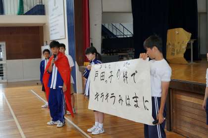みんなでごみを拾います。スローガンは「戸田っ子の絆でキラキラみはまに」です。