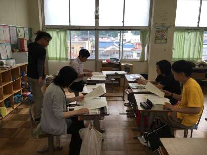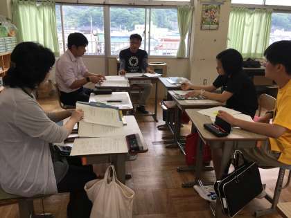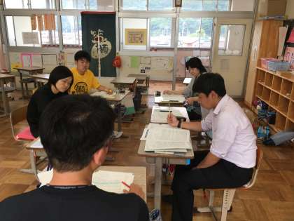 次回の小中合同授業研修を、小学校の教員、中学校の教員が集まり、小学校で行いました。授業案について、小中のつながりを意識しながら検討しました。